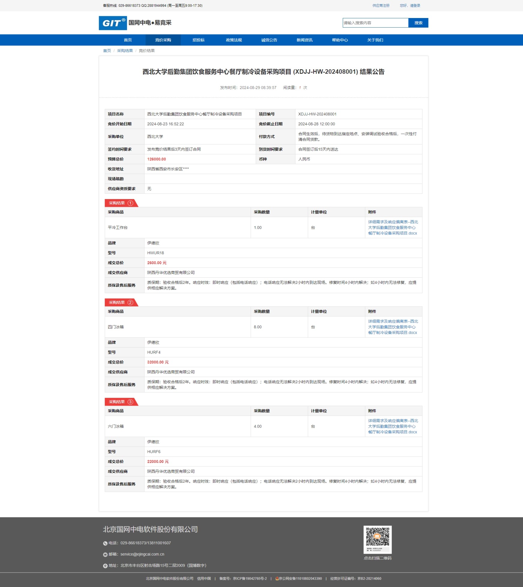 开云手机网页版登录入口后勤集团饮食服务中心餐厅制冷设备采购项目 (XDJJ-HW-202408001) 竞价结果公告 作者: 编辑:采购与招标办公室 时间:2024-08-29 原公告链接:https://www.ejingcai.com.cn/site/bidding/detail/12245