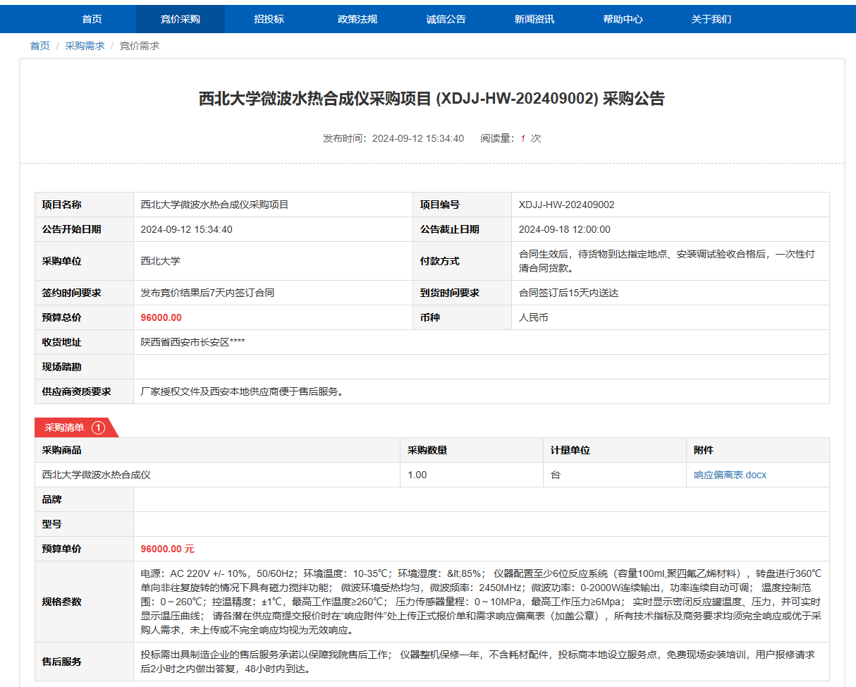开云手机网页版登录入口微波水热合成仪采购项目 (XDJJ-HW-202409002)竞价采购公告 作者: 编辑: 时间:2024-09-12 原公告链接:https://www.ejingcai.com.cn/site/bidding/detail/12527