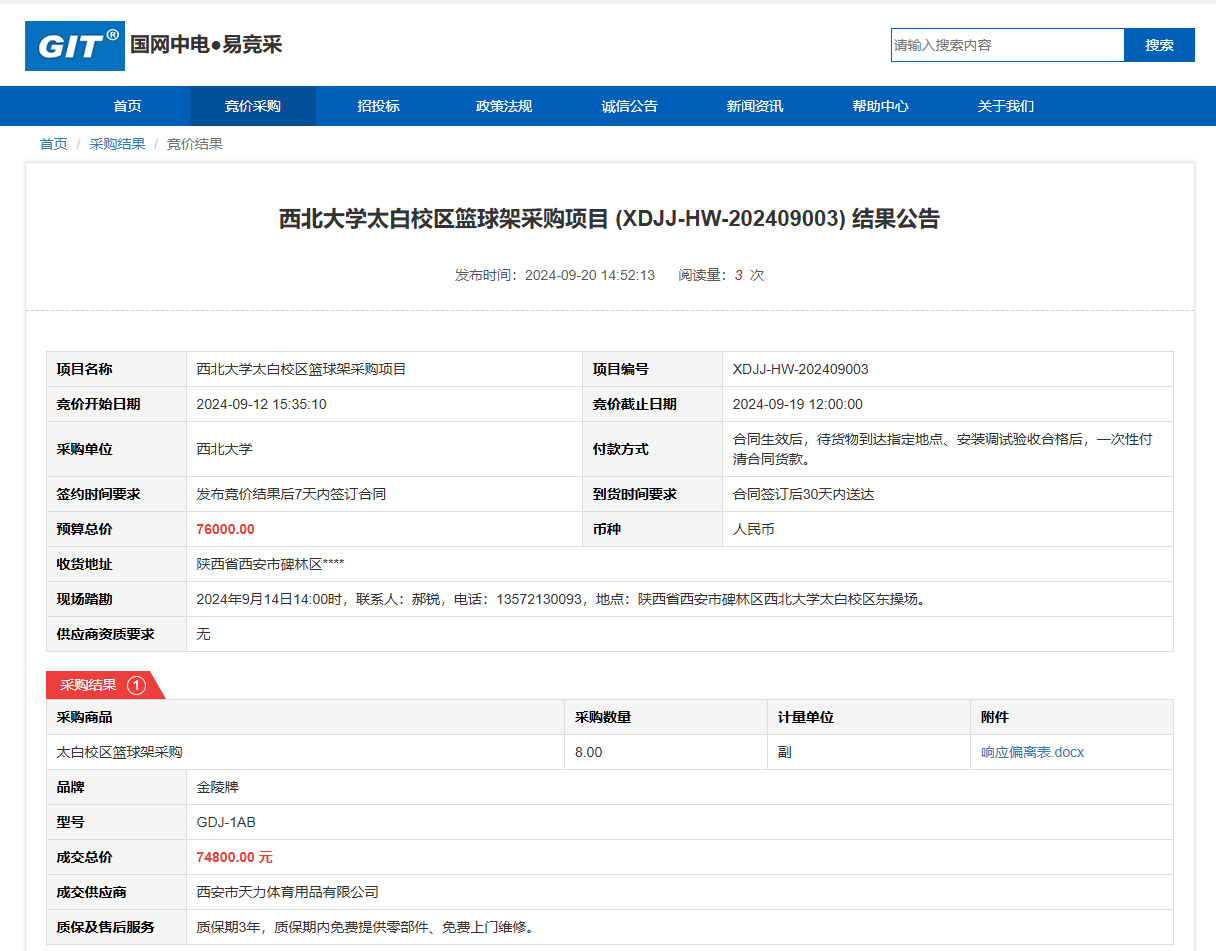 开云手机网页版登录入口太白校区篮球架采购项目 (XDJJ-HW-202409003)竞价结果公告 作者: 编辑: 时间:2024-09-20 原公告链接:https://www.ejingcai.com.cn/site/bidding/detail/12756