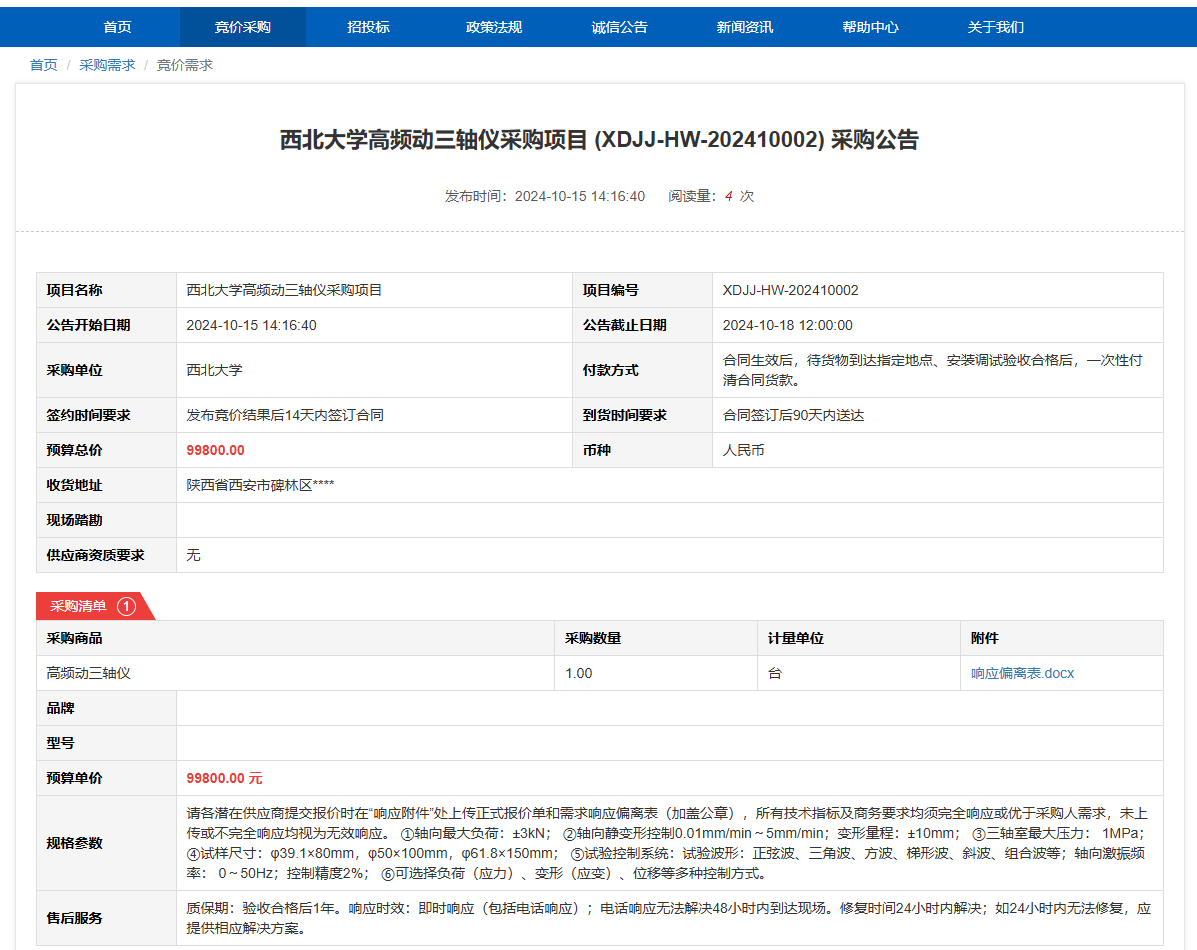 开云手机网页版登录入口高频动三轴仪采购项目(XDJJ-HW-202410002)竞价采购公告 作者:采购与招标办公室 编辑: 时间:2024-10-15 原公告链接:https://www.ejingcai.com.cn/site/bidding/detail/13317