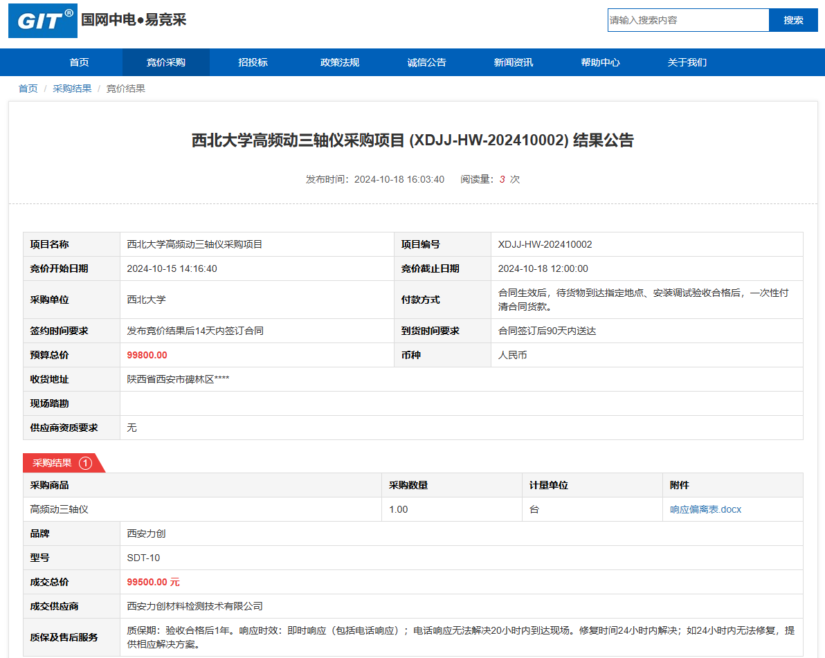 开云手机网页版登录入口高频动三轴仪采购项目(XDJJ-HW-202410002)竞价结果公告 作者:采购与招标办公室 编辑: 时间:2024-10-18 原公告链接:https://www.ejingcai.com.cn/site/bidding/detail/13488