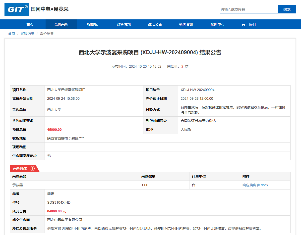 开云手机网页版登录入口示波器采购项目(XDJJ-HW-202409004)竞价结果公告 作者:采购与招标办公室 编辑: 时间:2024-10-23 原公告链接:https://www.ejingcai.com.cn/site/bidding/detail/13693