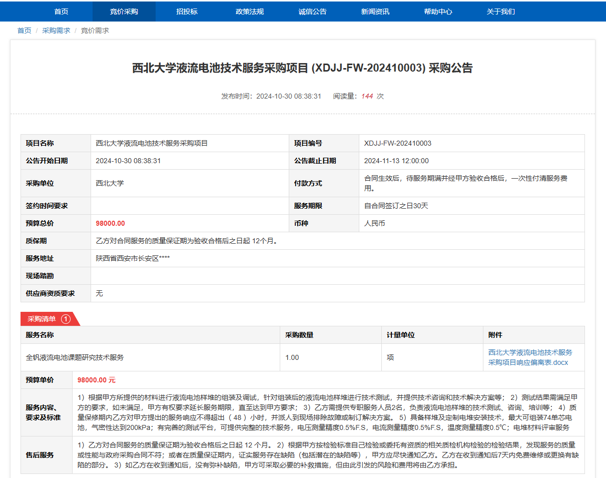 开云手机网页版登录入口液流电池技术服务采购项目(XDJJ-FW-202410003)竞价采购公告 作者:采购与招标办公室 编辑: 时间:2024-10-30 原公告链接:https://www.ejingcai.com.cn/site/bidding/detail/14096