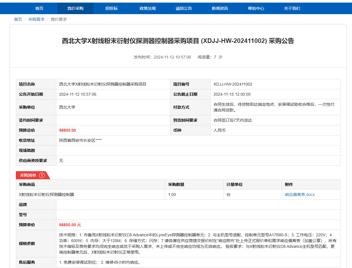 开云手机网页版登录入口X射线粉末衍射仪探测器控制器采购项目(XDJJ-HW-202411002)竞价采购公告 作者:采购与招标办公室 编辑: 时间:2024-11-12 原公告链接:https://www.ejingcai.com.cn/site/bidding/detail/14736