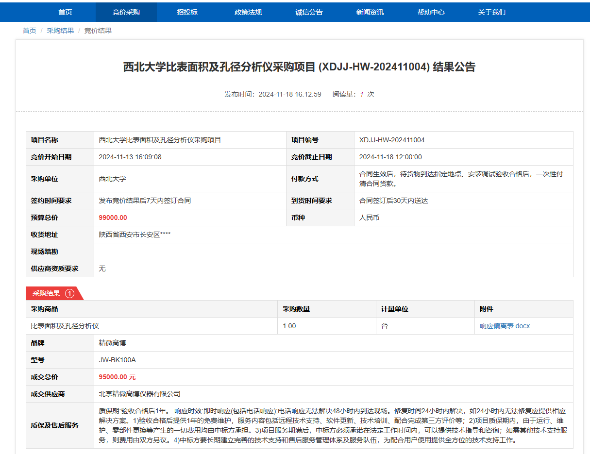开云手机网页版登录入口比表面积及孔径分析仪采购项目(XDJJ-HW-202411004)竞价结果公告 作者:采购与招标办公室 编辑: 时间:2024-11-18 原公告链接:https://www.ejingcai.com.cn/site/bidding/detail/15036