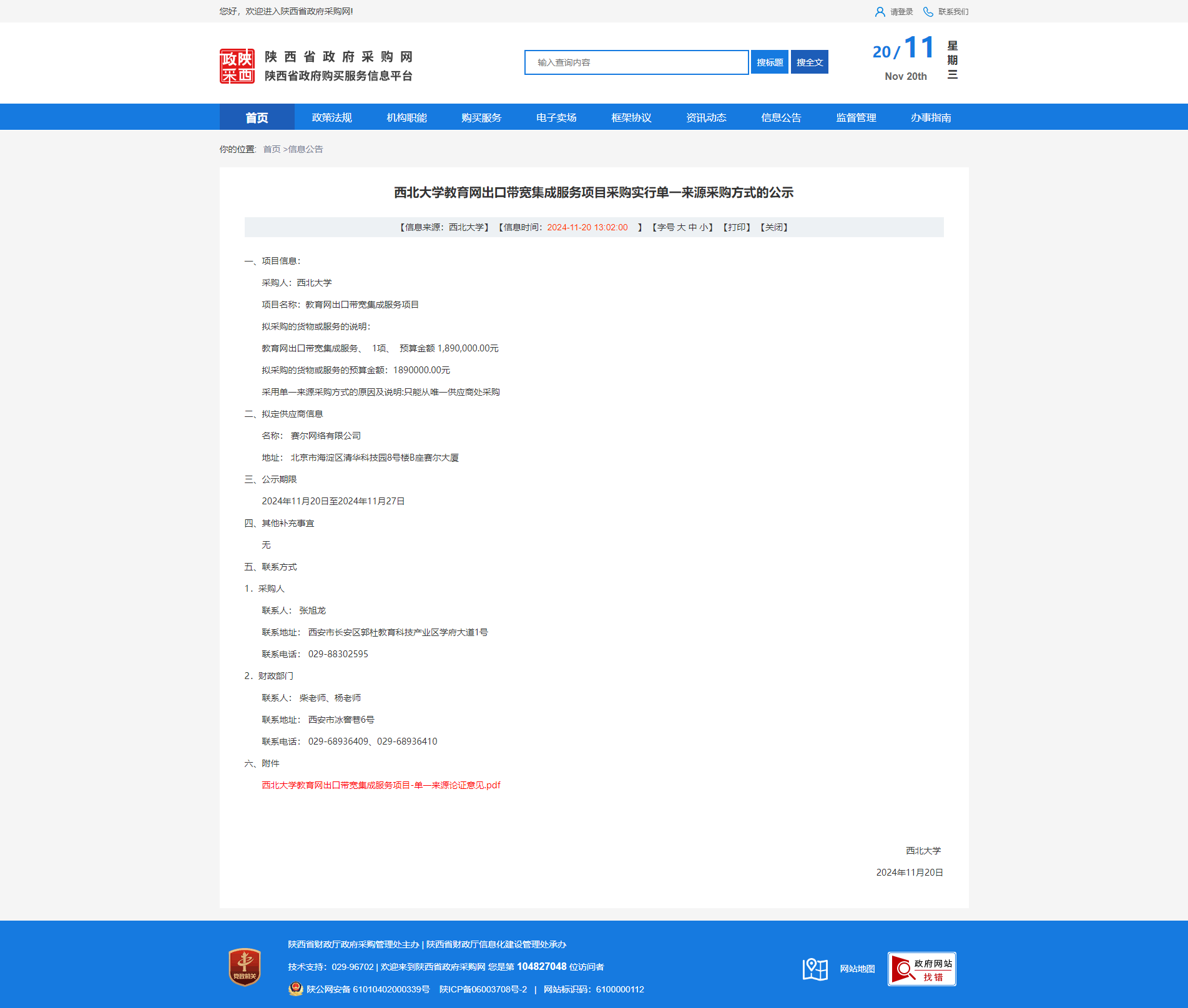 开云手机网页版登录入口教育网出口带宽集成服务项目采购实行单一来源采购方式的公示