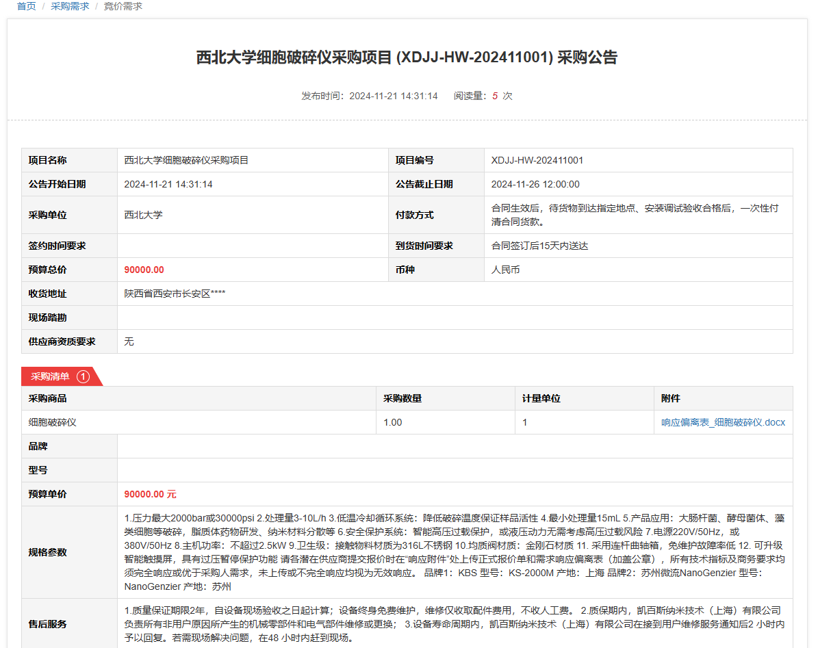 开云手机网页版登录入口细胞破碎仪采购项目(XDJJ-HW-202411001)竞价采购公告 作者:采购与招标办公室 编辑: 时间:2024-11-21 原公告链接:https://www.ejingcai.com.cn/site/bidding/detail/15200