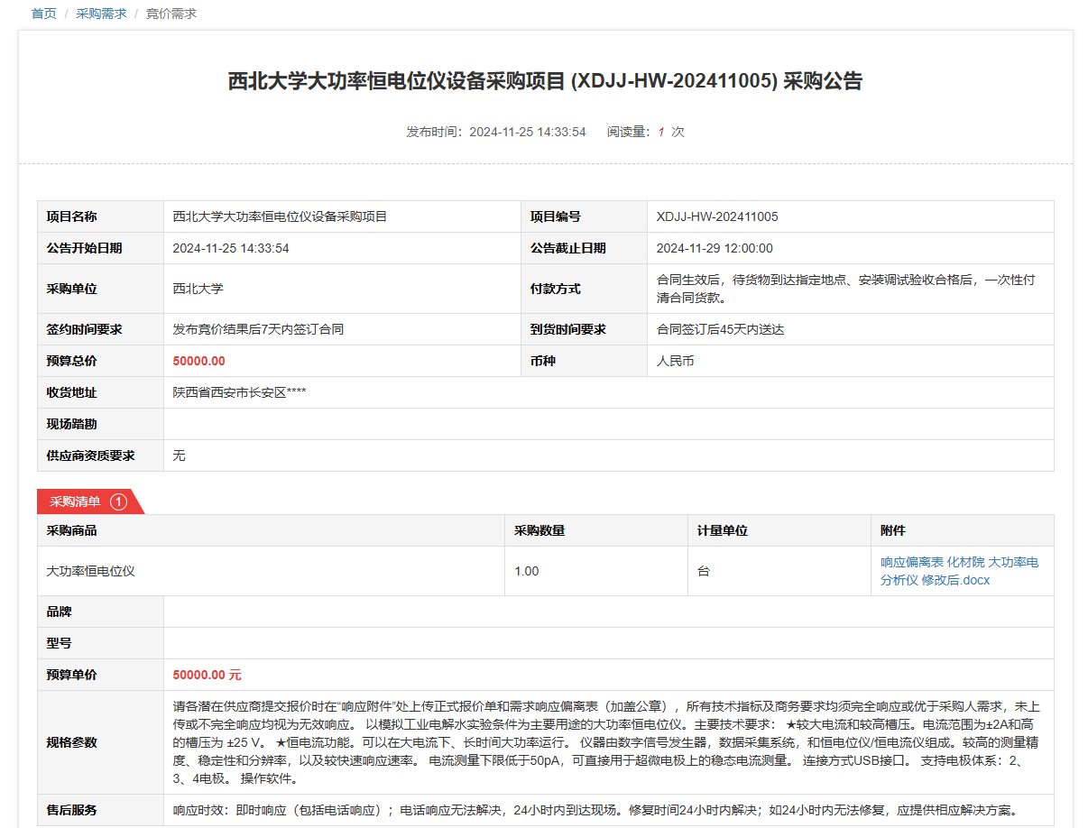 开云手机网页版登录入口大功率恒电位仪设备采购项目(XDJJ-HW-202411005)竞价采购公告 作者:采购与招标办公室 编辑: 时间:2024-11-25 原公告链接:https://www.ejingcai.com.cn/site/bidding/detail/15327