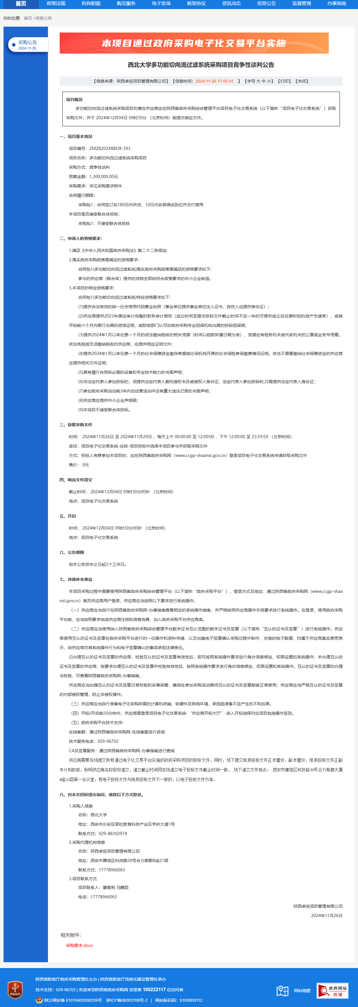 开云手机网页版登录入口多功能切向流过滤系统采购项目竞争性谈判公告 作者:采购与招标办公室 编辑: 时间:2024-11-26 原公告链接:https://www.ccgp-shaanxi.gov.cn/freecms/site/shaanxi/ggxx/info/2024/8a69c44e9218572b0193677ca4876f80.html?noticeType=001013¬iceId=80bc7ae0-abd6-11ef-8063-08c0eb20c666