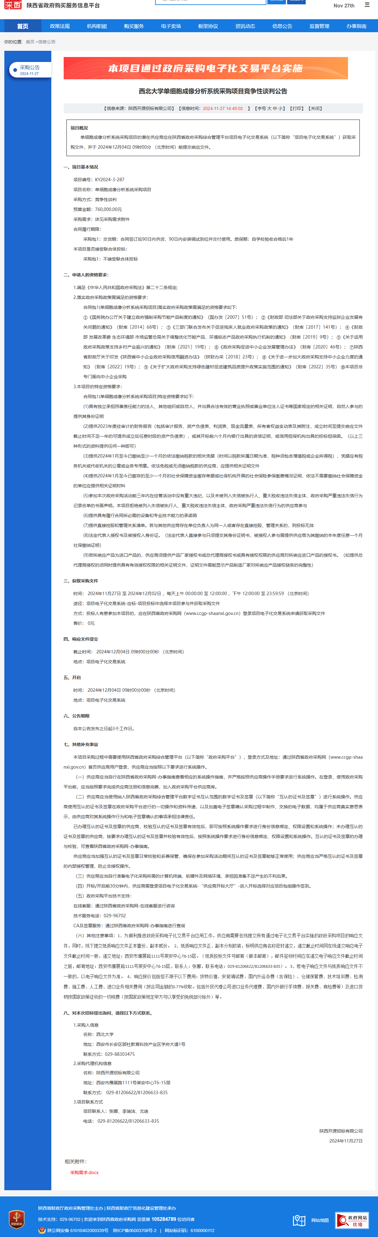 开云手机网页版登录入口单细胞成像分析系统采购项目竞争性谈判公告 作者:采购与招标办公室 编辑: 时间:2024-11-27 原公告链接:https://www.ccgp-shaanxi.gov.cn/freecms/site/shaanxi/ggxx/info/2024/8a69c44e9218572b01936c491bb73b3e.html?noticeType=001013¬iceId=477c80ef-ac8d-11ef-8063-08c0eb20c666