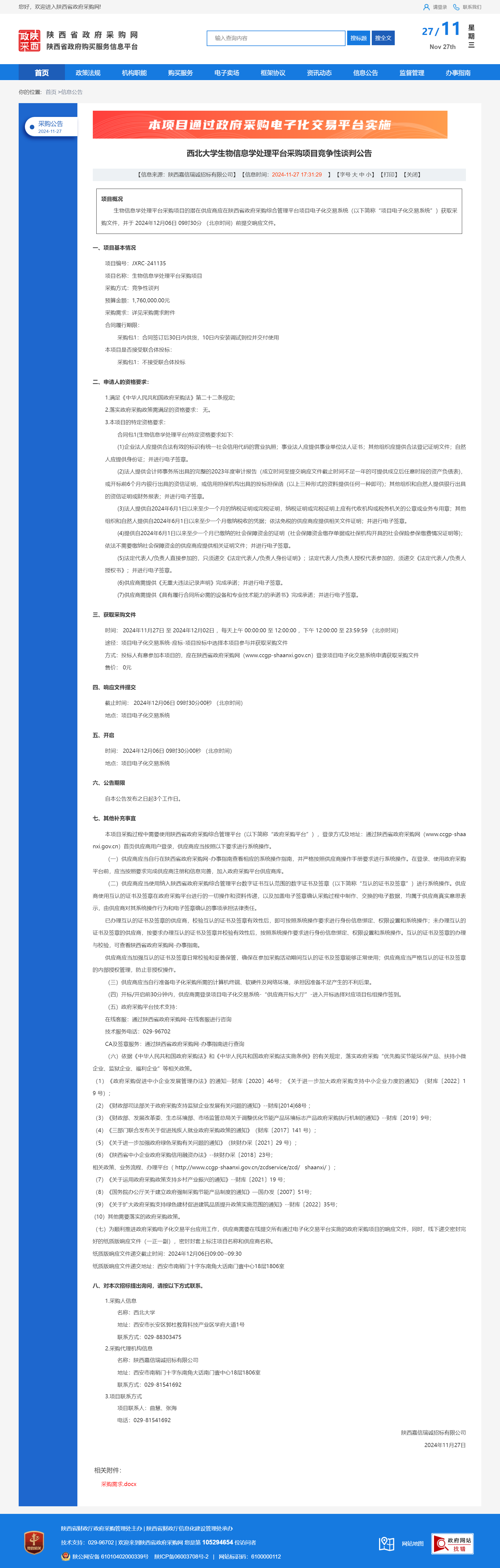 开云手机网页版登录入口生物信息学处理平台采购项目竞争性谈判公告 作者:采购与招标办公室 编辑: 时间:2024-11-27 原公告链接:https://www.ccgp-shaanxi.gov.cn/freecms/site/shaanxi/ggxx/info/2024/8a69c2519218573701936ce159174448.html?noticeType=001013¬iceId=f93e2324-aca3-11ef-8063-08c0eb20c666