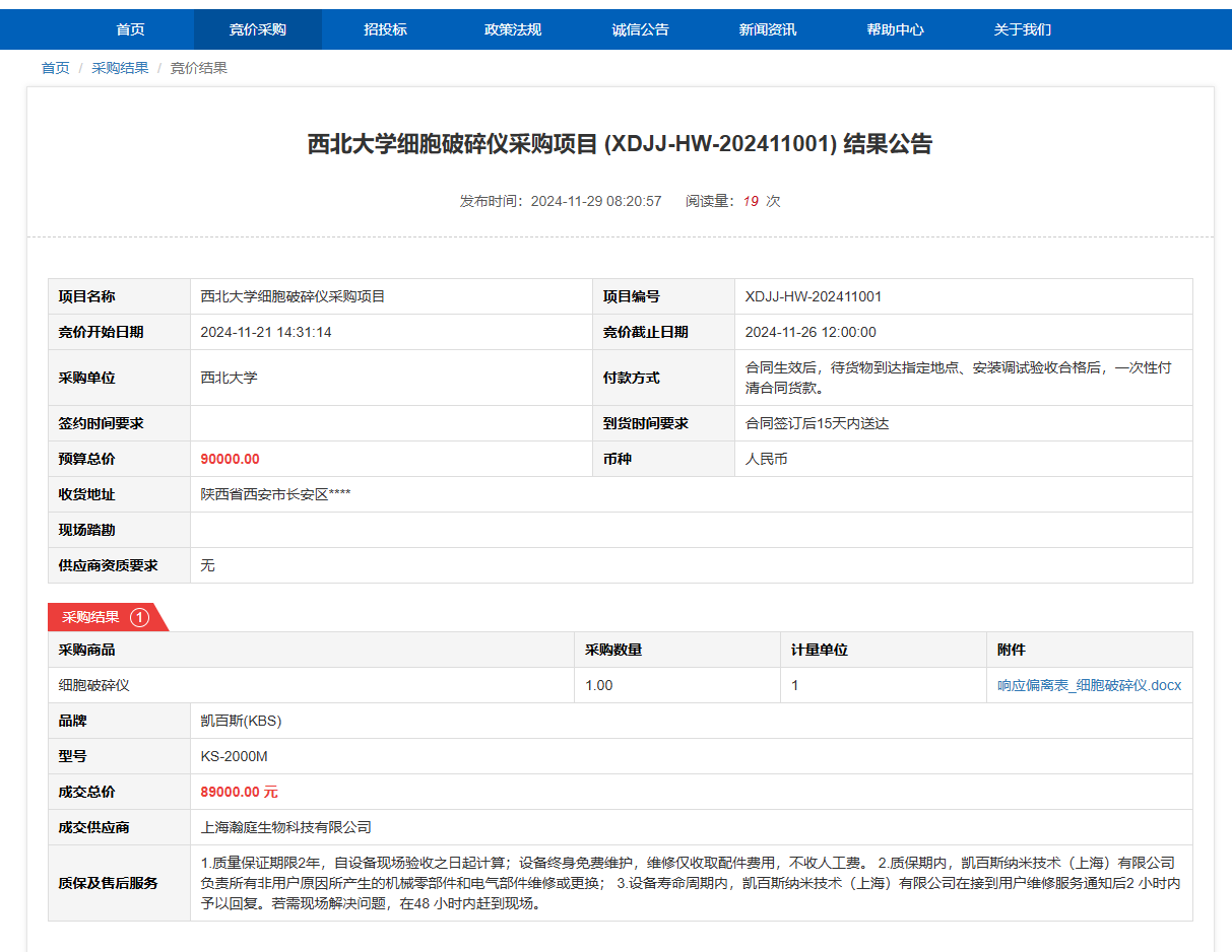 开云手机网页版登录入口细胞破碎仪采购项目(XDJJ-HW-202411001)竞价结果公告 作者:采购与招标办公室 编辑: 时间:2024-11-29 原公告链接:https://www.ejingcai.com.cn/site/bidding/detail/15477