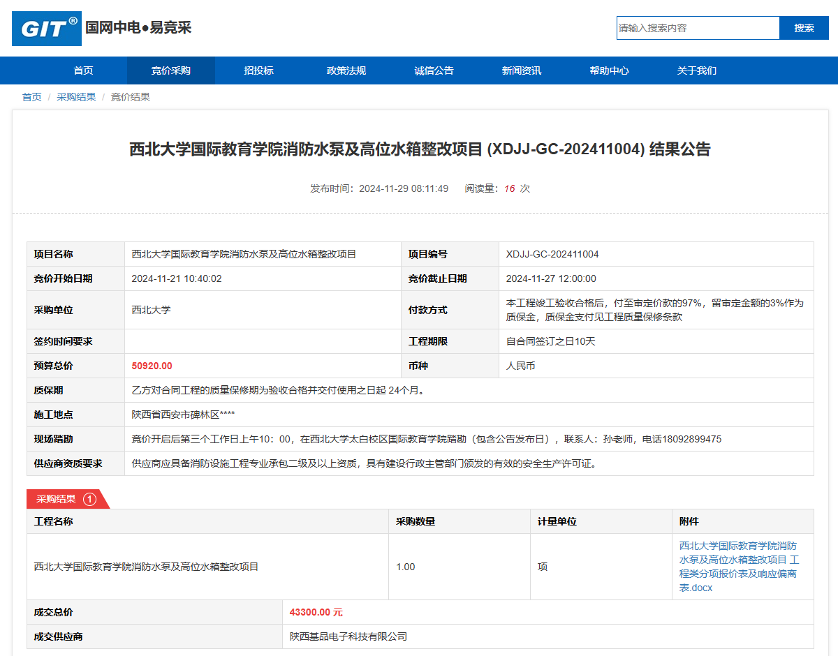 开云手机网页版登录入口国际教育学院消防水泵及高位水箱整改项目(XDJJ-GC-202411004)竞价结果公告 作者:采购与招标办公室 编辑: 时间:2024-11-29 原公告链接:https://www.ejingcai.com.cn/site/bidding/detail/15475