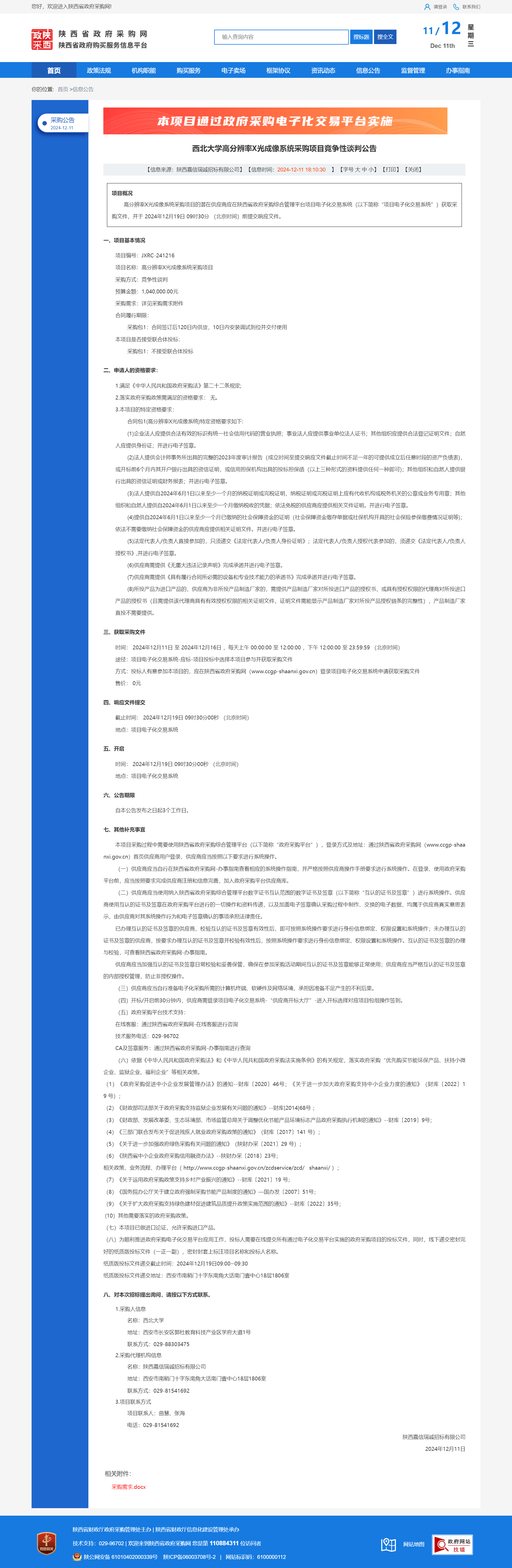 开云手机网页版登录入口高分辨率X光成像系统采购项目竞争性谈判公告 作者:采购与招标办公室 编辑: 时间:2024-12-11 原公告链接:https://www.ccgp-shaanxi.gov.cn/freecms/site/shaanxi/ggxx/info/2024/8a69c251921857370193b5010b9638d3.html?noticeType=001013¬iceId=c4fa68de-b7a9-11ef-8063-08c0eb20c666