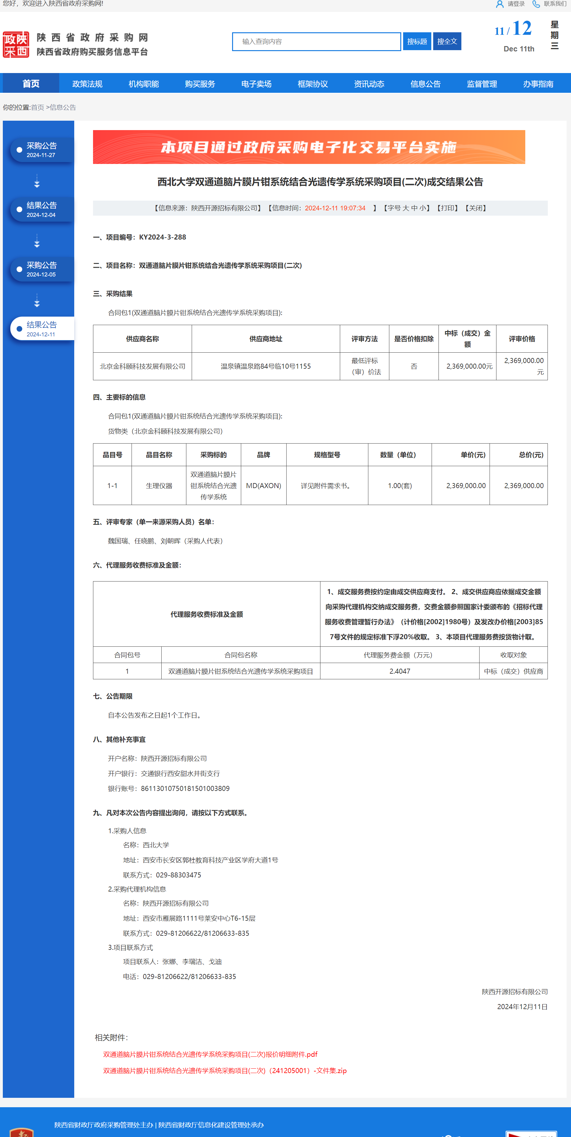 开云手机网页版登录入口双通道脑片膜片钳系统结合光遗传学系统采购项目(二次)成交结果公告 作者:采购与招标办公室 编辑: 时间:2024-12-11 原公告链接:https://www.ccgp-shaanxi.gov.cn/freecms/site/shaanxi/ggxx/info/2024/8a69c5a59218576d0193b551fa0d60e2.html?noticeType=001023¬iceId=be41a2eb-b7b1-11ef-8063-08c0eb20c666