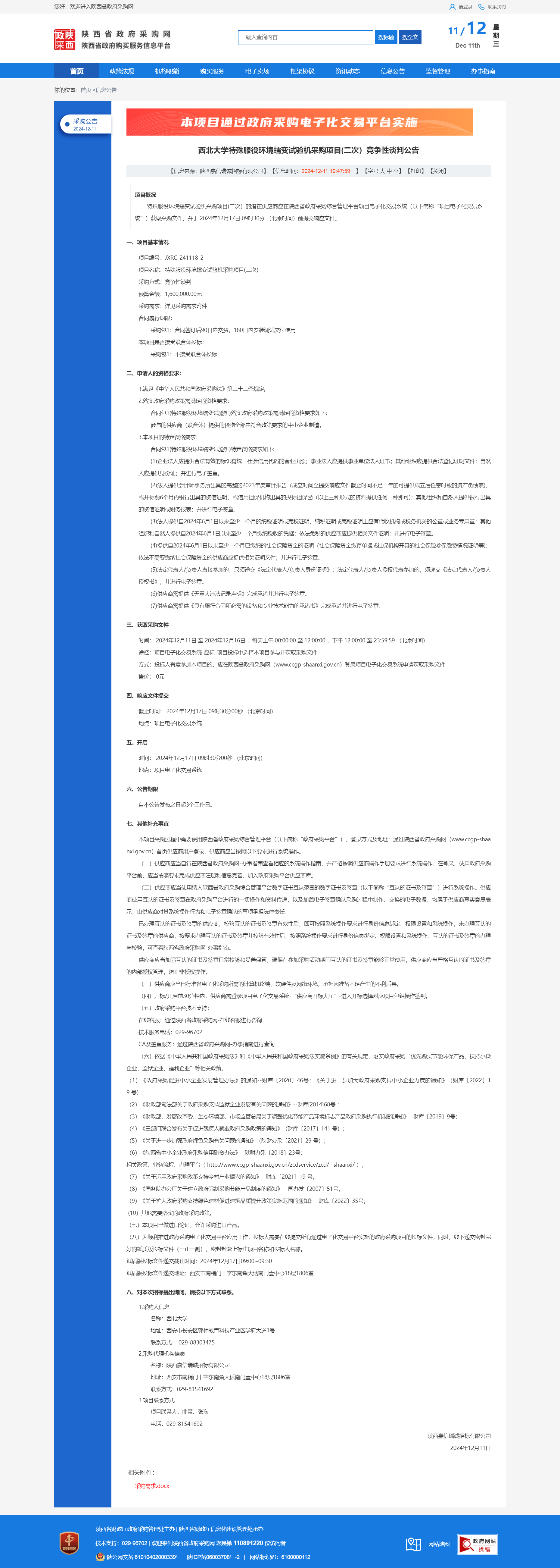 开云手机网页版登录入口特殊服役环境蠕变试验机采购项目(二次)竞争性谈判公告 作者:采购与招标办公室 编辑: 时间:2024-12-11 原公告链接:https://www.ccgp-shaanxi.gov.cn/freecms/site/shaanxi/ggxx/info/2024/8a69c5a59218576d0193b572f0492761.html?noticeType=001013¬iceId=632dd20f-b7b7-11ef-8063-08c0eb20c666
