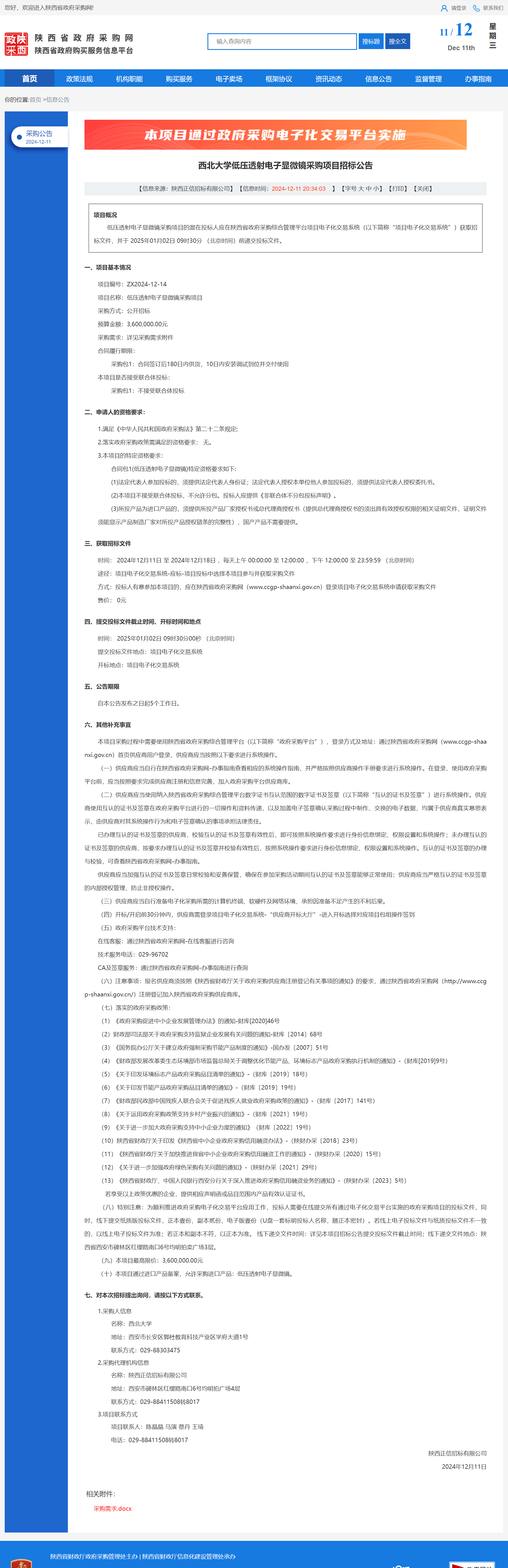 开云手机网页版登录入口低压透射电子显微镜采购项目招标公告 作者:采购与招标办公室 编辑: 时间:2024-12-11 原公告链接:https://www.ccgp-shaanxi.gov.cn/freecms/site/shaanxi/ggxx/info/2024/8a69c251921857370193b58a2eef18ef.html?noticeType=001011¬iceId=d31c6b03-b7bd-11ef-8063-08c0eb20c666