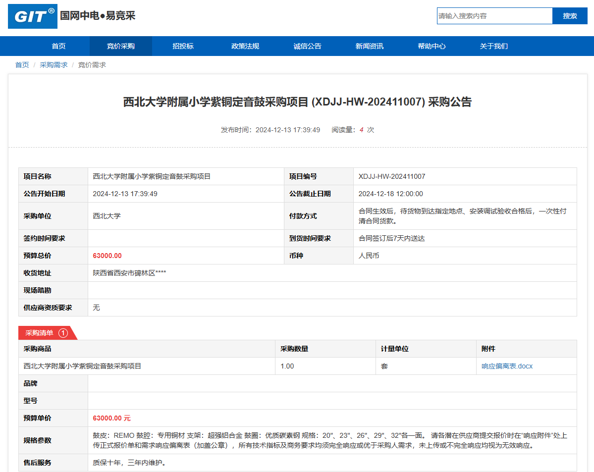 开云手机网页版登录入口附属小学紫铜定音鼓采购项目(XDJJ-HW-202411007)竞价采购公告 作者:采购与招标办公室 编辑: 时间:2024-12-13 原公告链接:https://www.ejingcai.com.cn/site/bidding/detail/15969