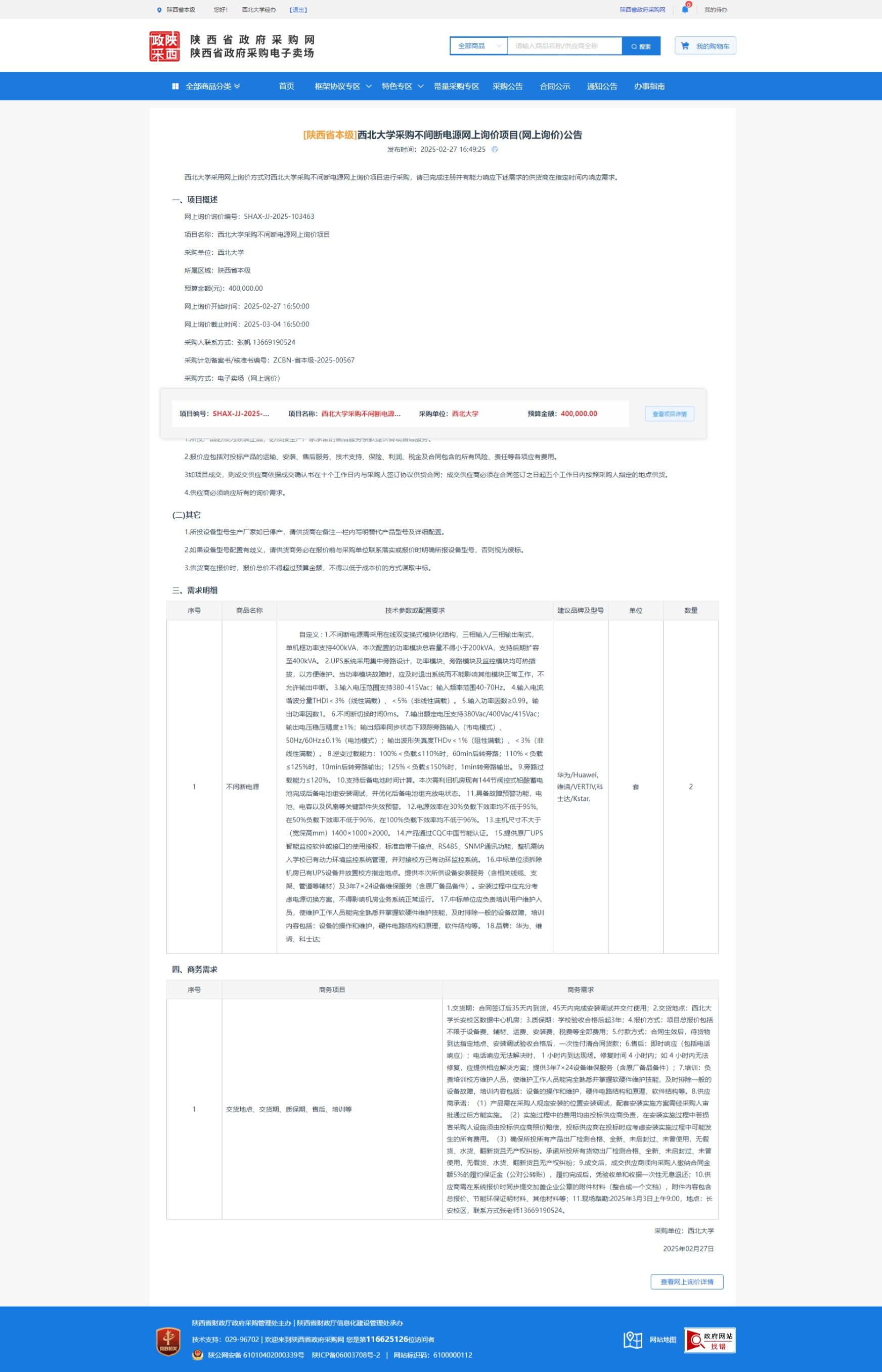 开云手机网页版登录入口采购不间断电源网上询价项目(网上询价)公告 作者: 编辑: 时间:2025-02-27 原公告链接:https://www.ccgp-shaanxi.gov.cn/gpmall-main-web/basic/noticeDetail?noticeGuid=7294181247151177728