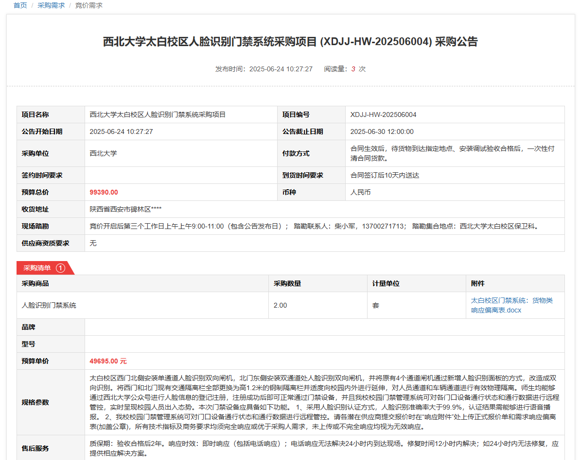 开云手机网页版登录入口太白校区人脸识别门禁系统采购项目(XDJJ-HW-202506004)竞价采购公告 作者: 编辑: 时间:2025-06-24 原公告链接:https://www.ejingcai.com.cn/site/bidding/detail/19128