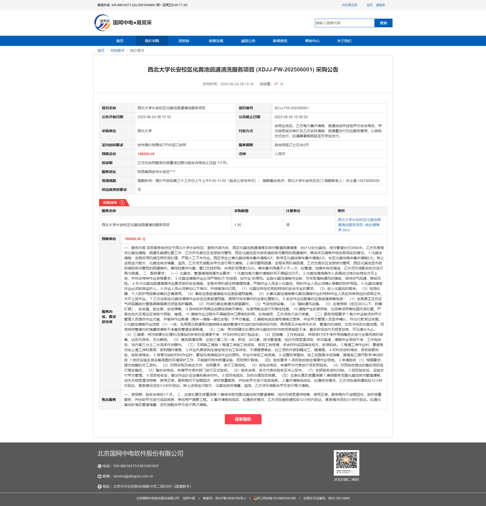 开云手机网页版登录入口长安校区化粪池疏通清洗服务项目 (XDJJ-FW-202506001) 采购公告