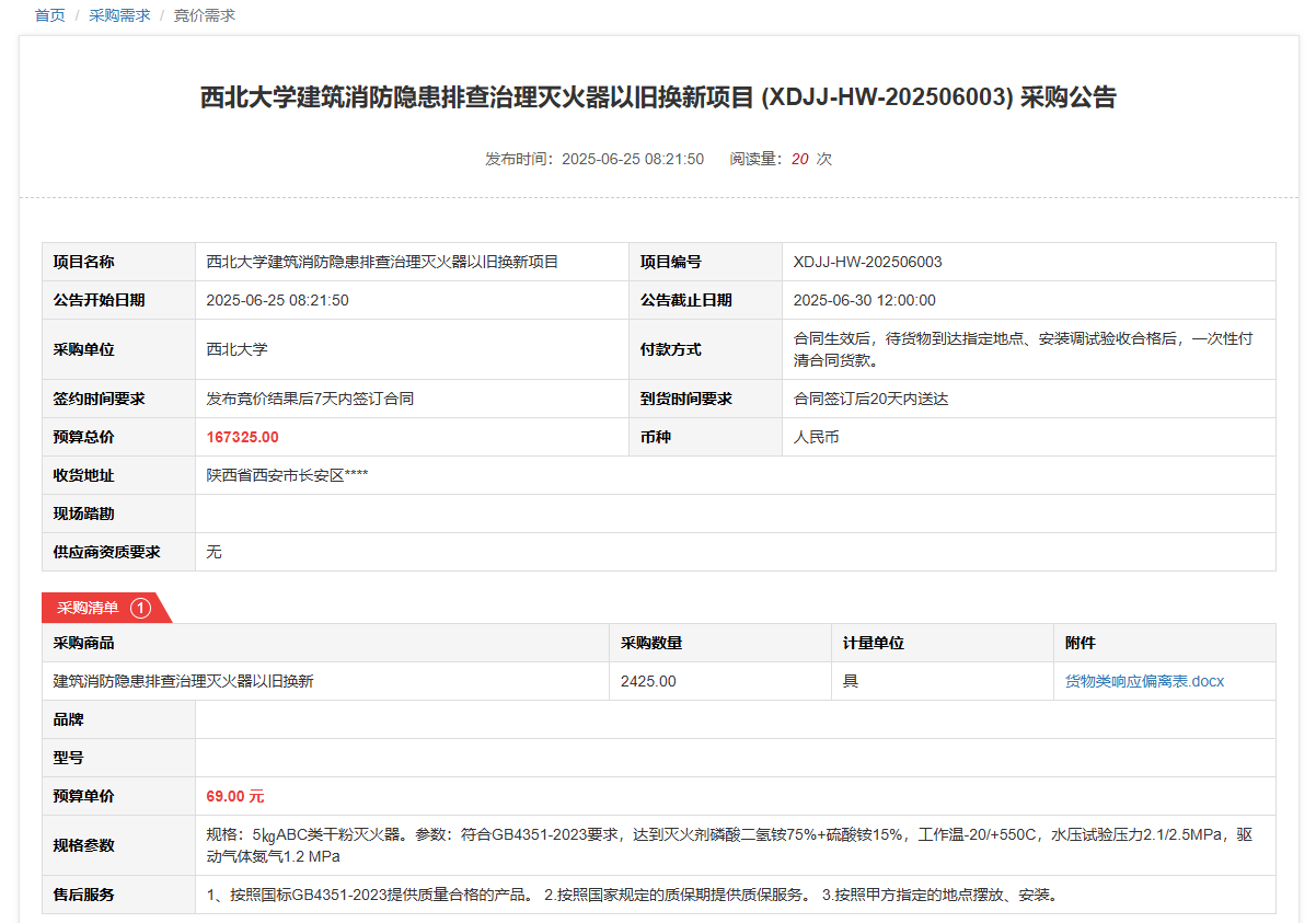开云手机网页版登录入口建筑消防隐患排查治理灭火器以旧换新项目(XDJJ-HW-202506003)竞价采购公告 作者:采购与招标办公室 编辑: 时间:2025-06-25 原公告链接:https://www.ejingcai.com.cn/site/bidding/detail/19167