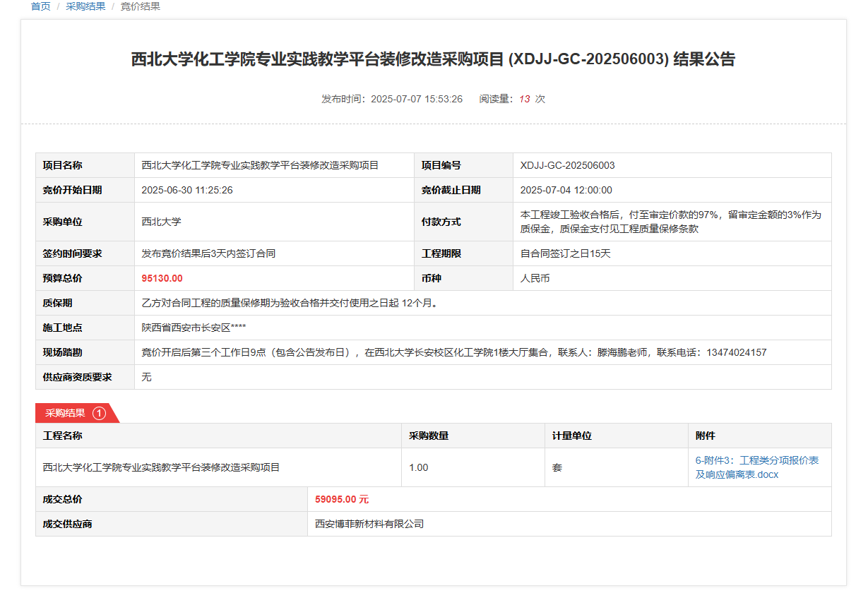 开云手机网页版登录入口化工学院专业实践教学平台装修改造采购项目(XDJJ-GC-202506003)竞价结果公告