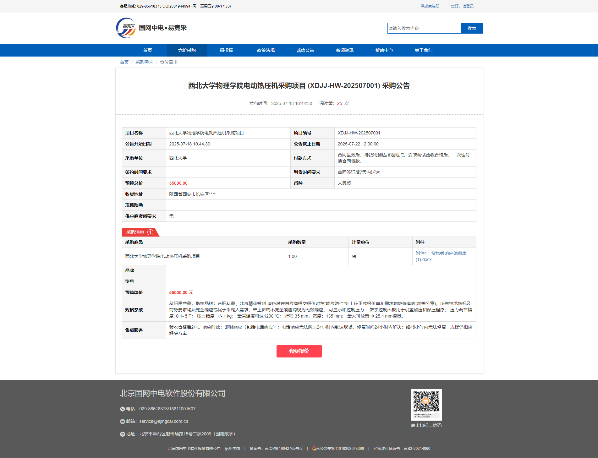 开云手机网页版登录入口物理学院电动热压机采购项目(XDJJ-HW-202507001)竞价采购公告