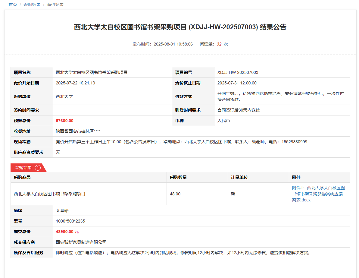 开云手机网页版登录入口太白校区图书馆阅览桌椅采购项目(XDJJ-HW-202507004)竞价结果公告