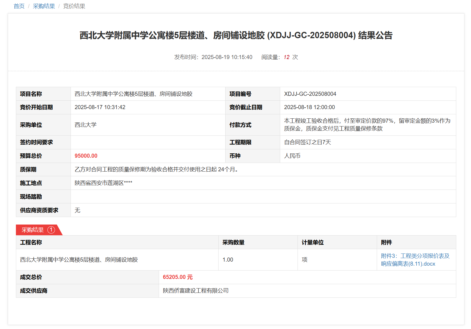 开云手机网页版登录入口附属中学公寓楼5层楼道、房间铺设地胶(XDJJ-GC-202508004)竞价结果公告