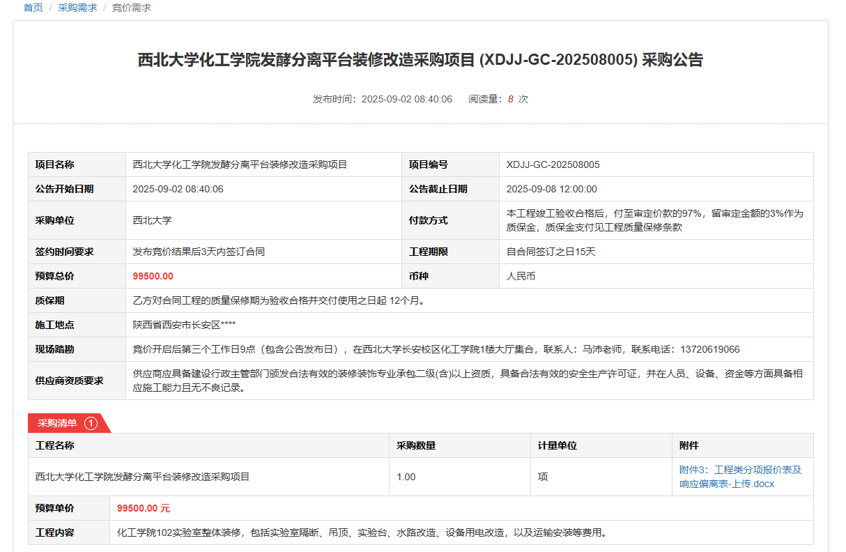 开云手机网页版登录入口化工学院发酵分离平台装修改造采购项目(XDJJ-GC-202508005)竞价采购公告