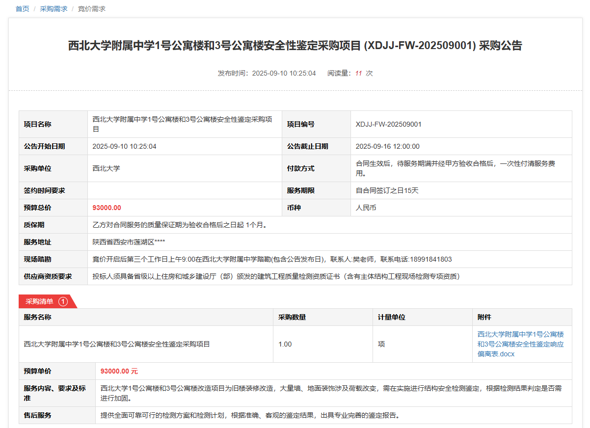 开云手机网页版登录入口附属中学1号公寓楼和3号公寓楼安全性鉴定采购项目(XDJJ-FW-202509001)竞价采购公告