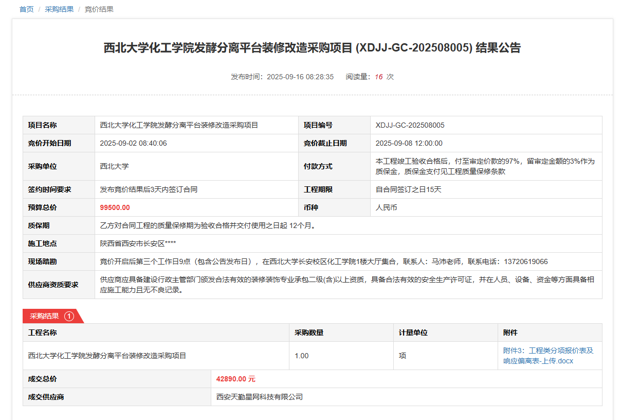 开云手机网页版登录入口化工学院发酵分离平台装修改造采购项目(XDJJ-GC-202508005)竞价结果公告