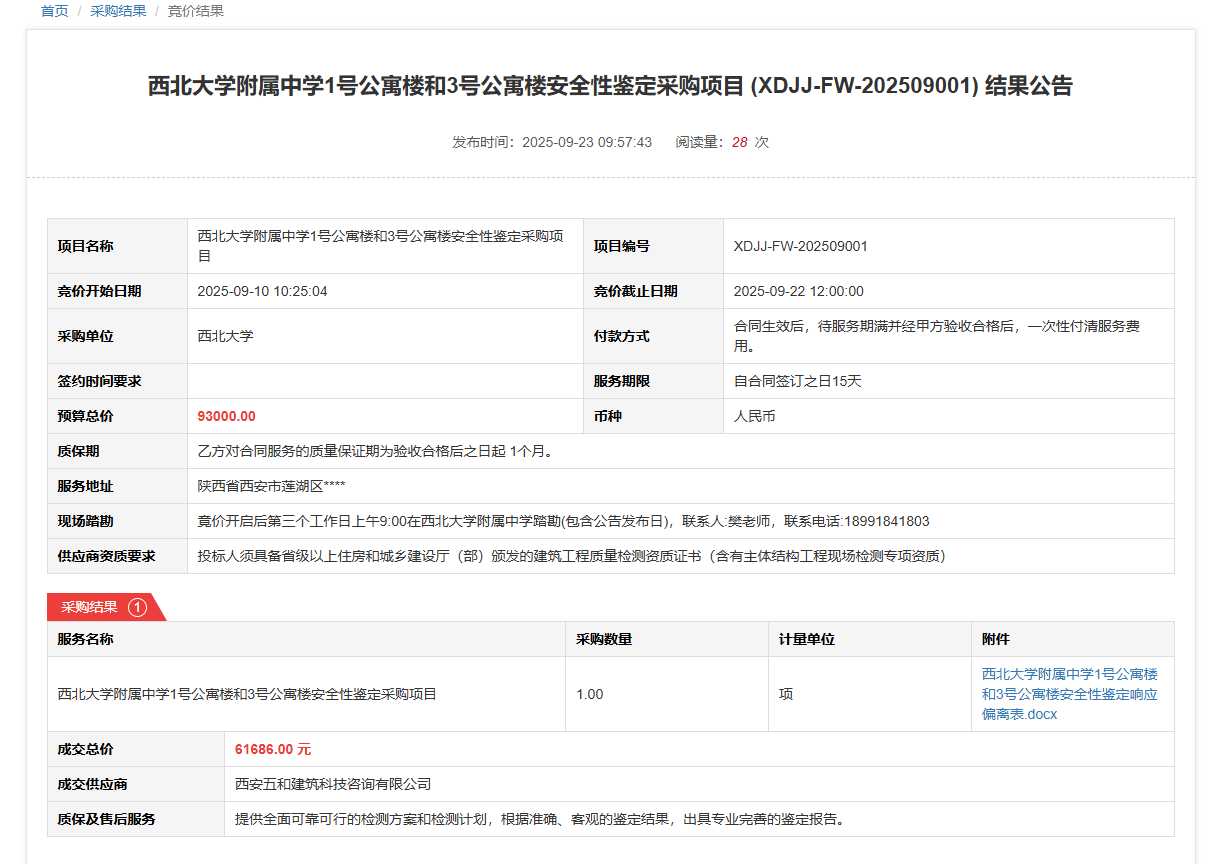 开云手机网页版登录入口附属中学1号公寓楼和3号公寓楼安全性鉴定采购项目(XDJJ-FW-202509001)竞价结果公告
