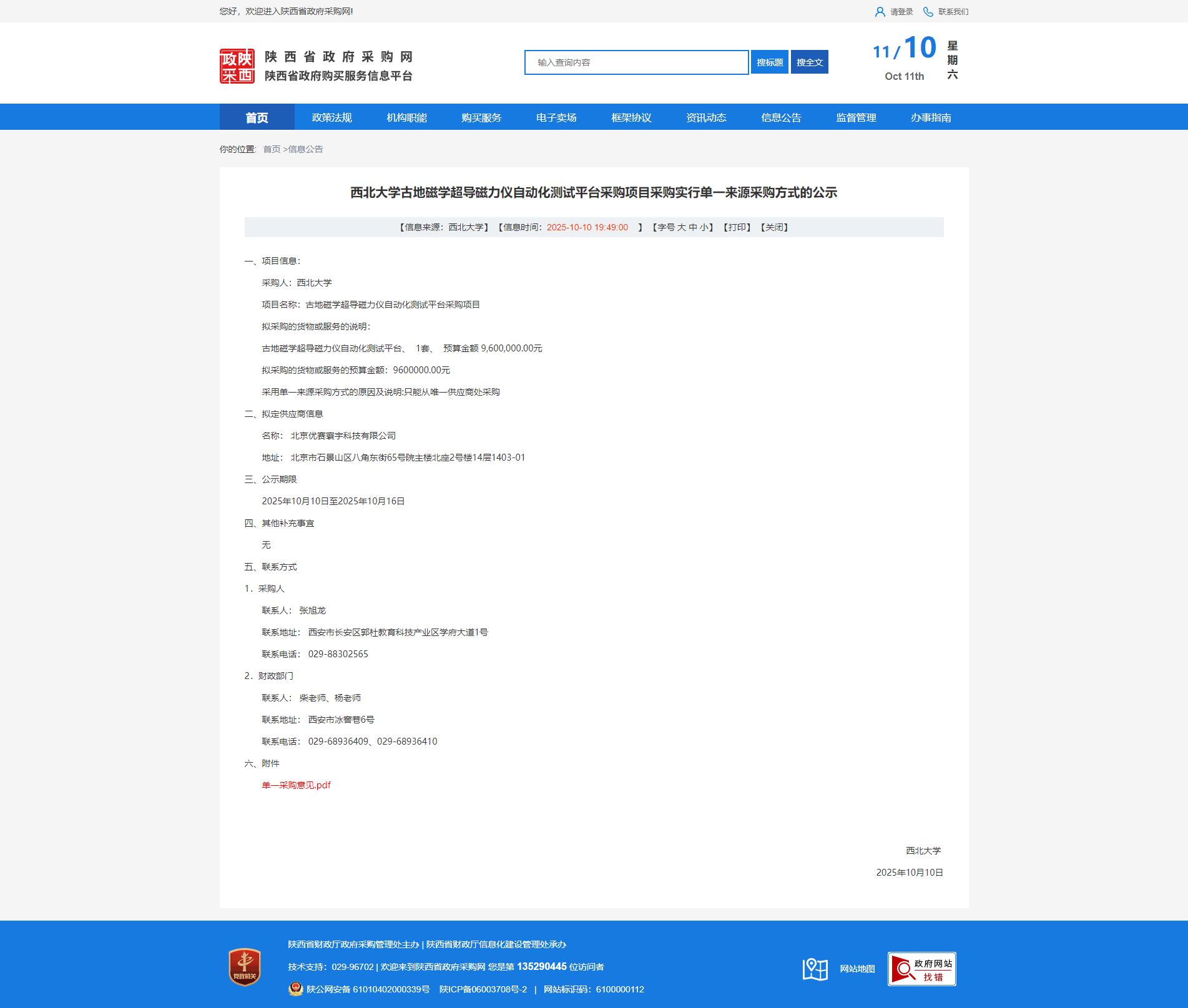 开云手机网页版登录入口古地磁学超导磁力仪自动化测试平台采购项目采购实行单一来源采购方式的公示