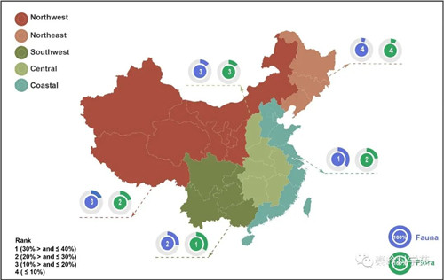 该研究论文作者之一的开云手机网页版登录入口张河博士进而说明,中国沿海地区植物多样性排名第一和第二,分别拥有 35.55% 和 23.41% 的植物和动物资源。沿海地区的低等动物比例较高(腹足纲、蛛形纲、昆虫纲、爬行纲和爬行纲的比例超过 35%,鸟类的比例超过 40%)。该地区还有超过 20% 的维管植物和非维管植物以及哺乳动物。中国西南地区总体的植物 (33.90%) 和动物(27.3%) 多样性水平最高。