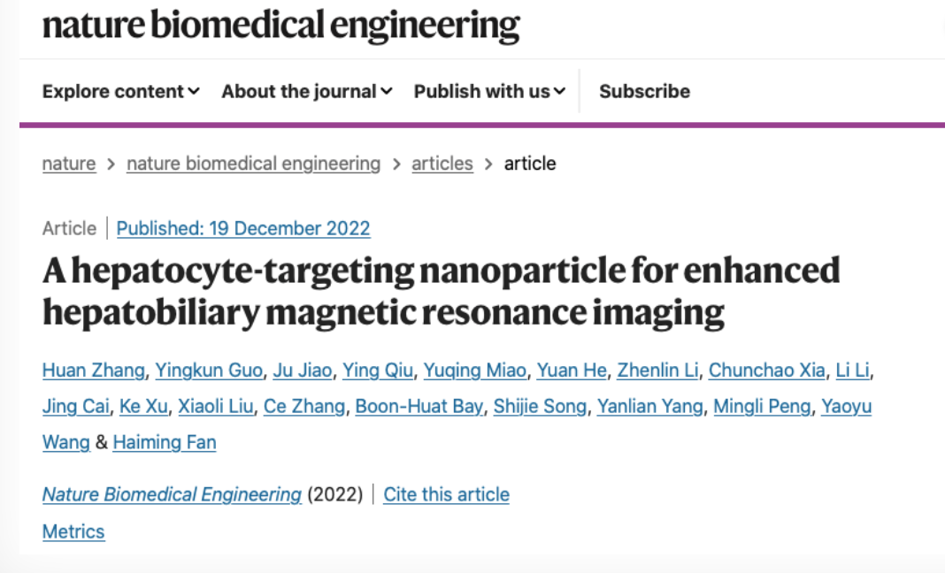 相关成果以“A Hepatocyte-targeting Nanoparticle for Enhanced Hepatobiliary Magnetic Resonance Imaging”为题,于2022年12月19日在线发表于Nature Biomedical Engineering(自然生物医学工程)杂志,这是学校首次在该杂志上发表论文。