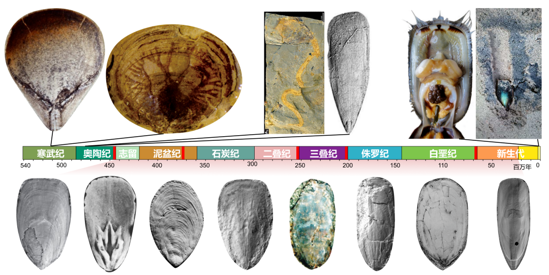 图示5亿年以来“活化石”舌形贝类的壳体形态及演变