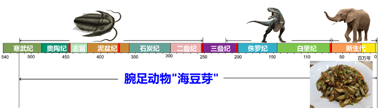 腕足动物舌形贝(lingulid)被达尔文定义为“活化石”。由于其形似豆芽菜,因此被称作“海豆芽”。它自寒武纪早期出现,历经了地球动物出现以来所有的磨难和自然灾害,尤其是经受了地球最严重的“五次生物大绝灭”事件而繁衍至今。目前仍分布在我国广西和日本、新西兰等地的近岸浅海地区,成为当地桌上的一道美食。