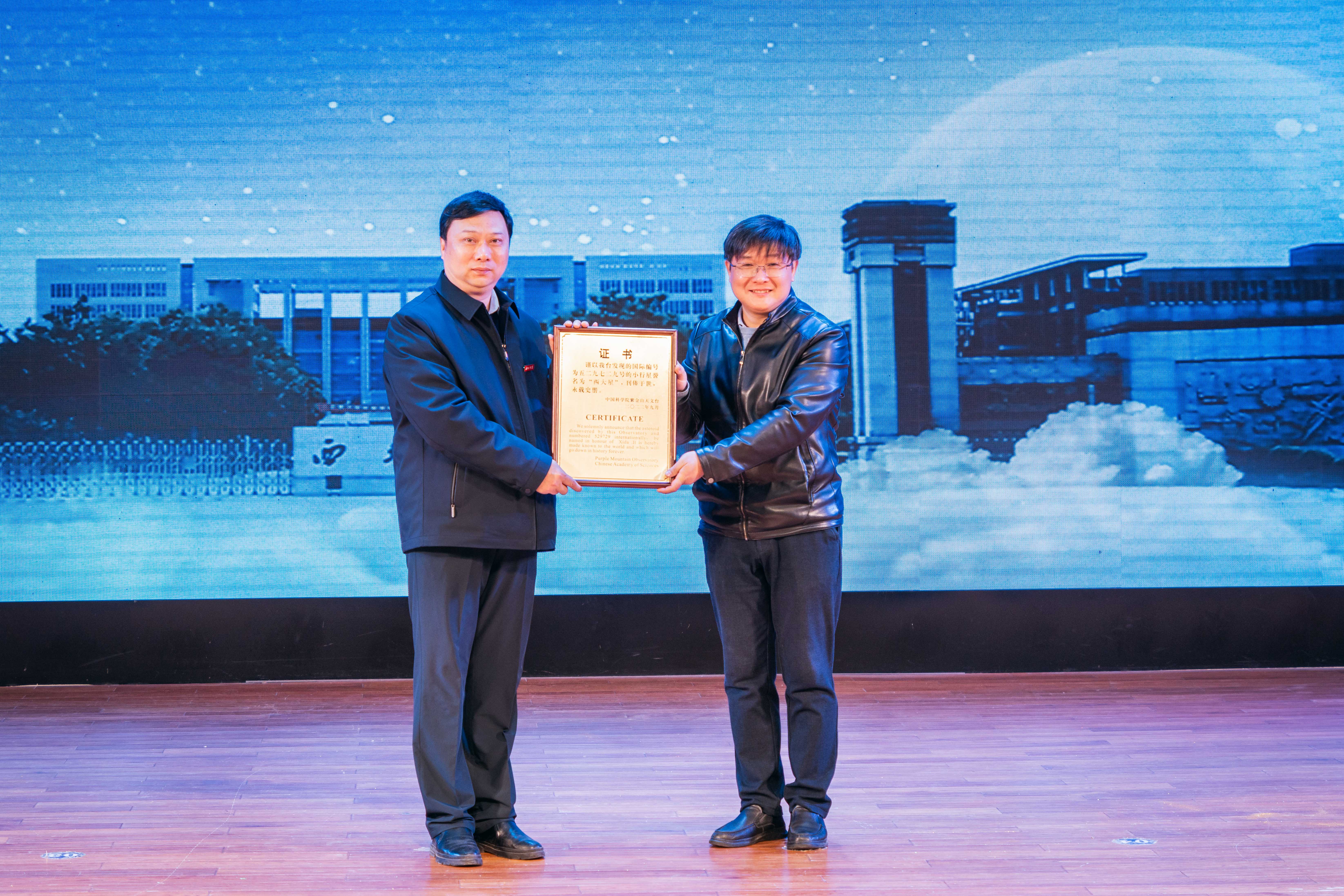 吴雪峰向开云手机网页版登录入口赠送“Xida”星证书、命名公报,赖绍聪、张远军代表学校接受相关资料。