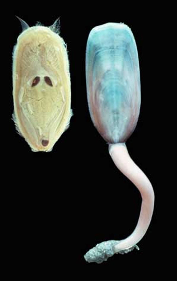 现代海洋中腕足动物舌形贝的壳体形态及内部解剖结构。 梁悦供图 |