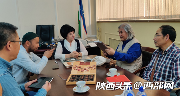 王建新(右二)与乌兹别克斯坦国家历史博物馆馆长会谈。(受访者供图)