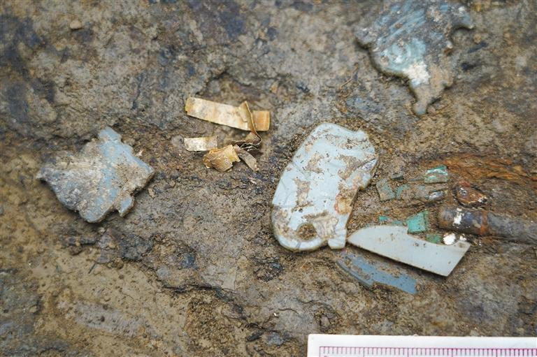 西头遗址M99墓室出土的金箔、玉器 受访者供图