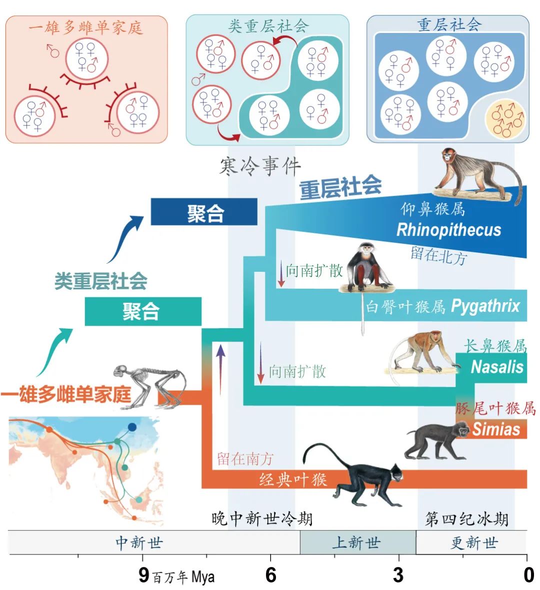 大约800万年前的中新世,亚洲叶猴的祖先从欧洲扩散而来。其中一支,从印度半岛扩散到了东南亚地区,这一类群分化成三个属,并保留了祖先的一雄多雌制“单家庭群”社会系统。而另一支在晚中新世扩散到了中国云南,形成了奇鼻猴的基部类群。伴随着这一地区晚中新世的寒冷事件,它们的家庭群不再互相排斥,时而分离,时而聚合,形成了类重层社会。由于食物匮乏,大多数奇鼻猴后来向南扩散,演化出白臀叶猴和长鼻猴等不同物种。时至今日,尽管它们生活在越南和加里曼丹岛的温暖地区,却仍然保留着类重层社会这一结构特征。但与此同时,留在中国北方的近亲金丝猴,却在更新世反复的冰期与间冰期的一次次寒冷事件中,拉近了社会关系,培养出家庭间长期、稳定的纽带联系,演化出了真正的重层社会。