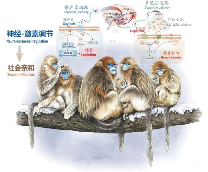 “在哺乳动物中,催产素和多巴胺具有强化母亲与幼儿之间的纽带的作用。寒冷效应引发它们的适应性变化,强化了母婴间的纽带,延长了寒冷地区奇鼻猴的亲本抚育。同时,个体间的友好行为也得到促进,进而推动了单家庭群向重层社会的聚集。”齐晓光介绍。这一结果还得到了细胞功能实验和行为学实验的验证。