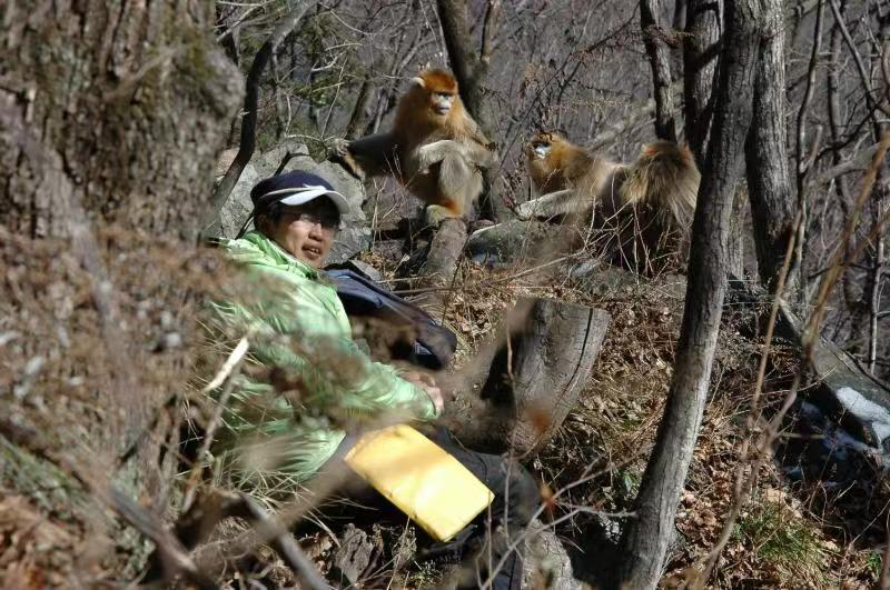 Qi Xiaoguang closely observes the behavior of golden monkeys in the wild. [Photo provided to chinadaily.com.cn]