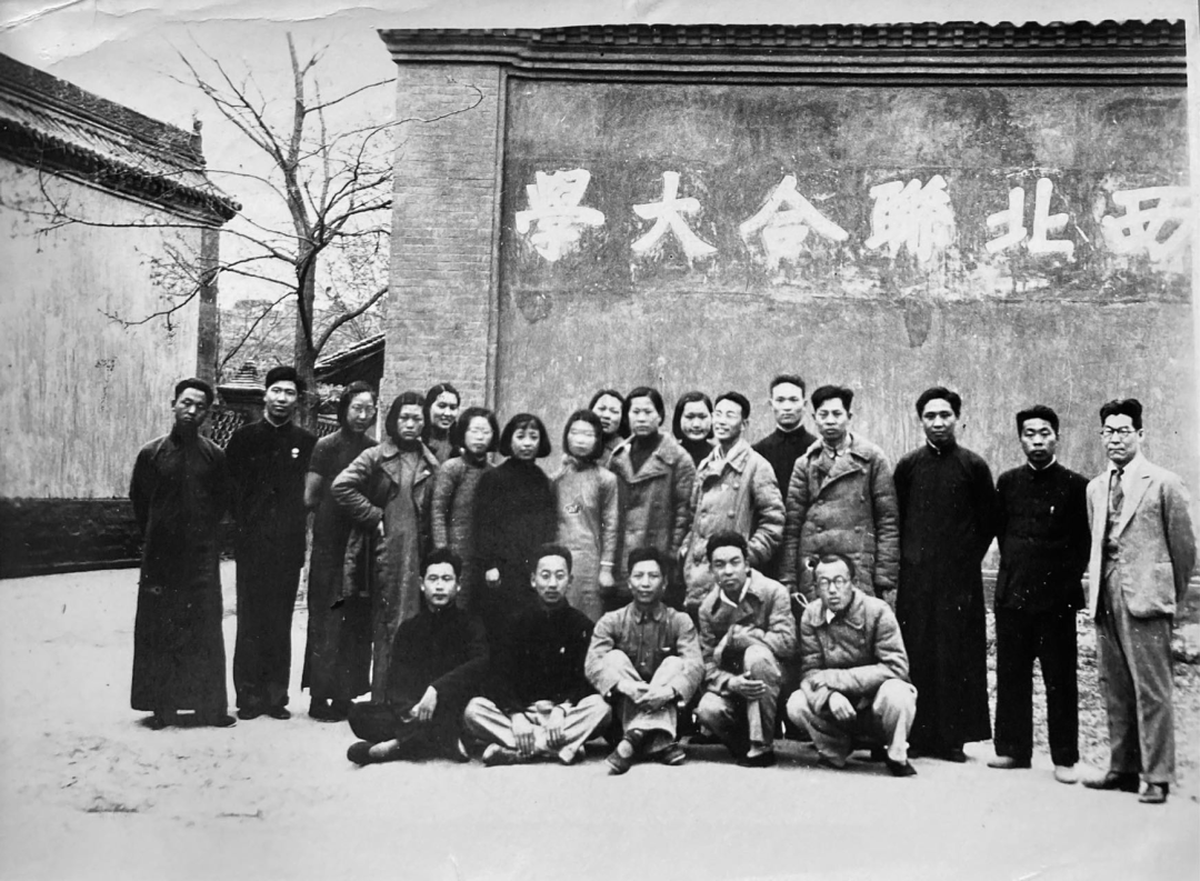 西北联合大学学生在校名影壁前合影。 (图片由张在军收集)