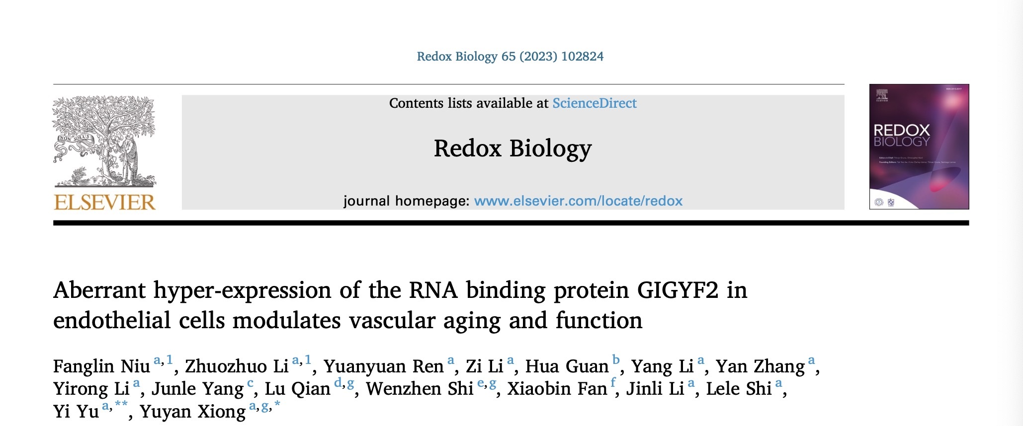 近日,开云手机网页版登录入口生命科学与医学部熊裕焱教授团队在GIGYF2在血管内皮细胞衰老中的生物功能及其调控机制的研究中取得了新进展,研究结果发表在Redox Biology,题为“Aberrant hyper-expression of the RNA binding protein GIGYF2 in endothelial cells modulates vascular aging and function”。