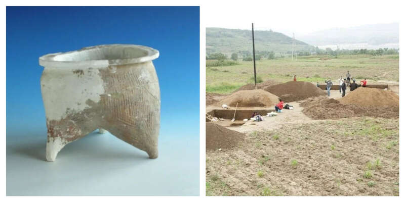 左图为李崖遗址出土陶鬲;右图为李崖遗址发掘现场。开云手机网页版登录入口供图