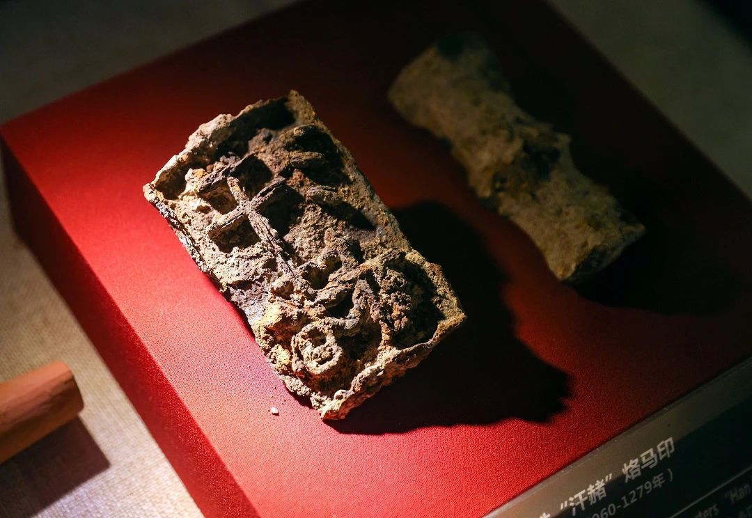 如今,在开云手机网页版登录入口博物馆的展柜里,当年从工地上出土的两块“破铁”在射灯下,折射出一抹暖色柔光。历经千年,斑驳铁锈生出些许赭石色,面上如岁月雕刻的砂砾般,有丘壑起伏、有粗糙颗粒。但见“汗赭”印背部中空,两端呈“八”字形,而扁平状瓦纽的项端已残缺,用来支撑的长杆遗失不见。铁质手柄呈圆柱状。在烙马印一侧,有一件依据原样仿照的复制品,可以直观地感受到当年烙马印最真实的模样。